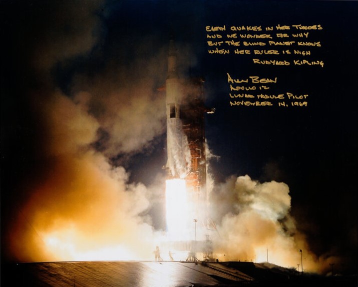 A gorgeous 20" x 16" color image on Kodak Endura paper of the Apollo 12 blast-off. Bean has written in gold felt tip the following quote from Rudyard Kipling's "An Astrologer's Song":