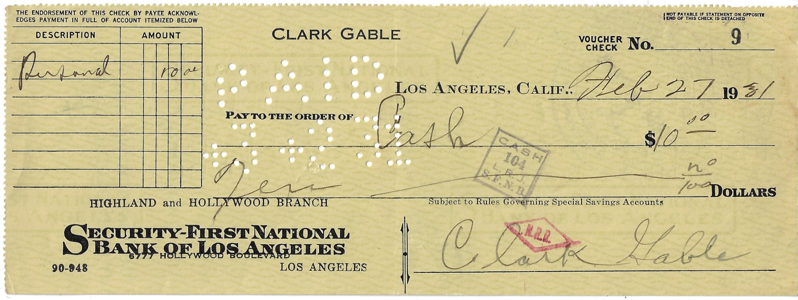 Early personal check, filled out in another hand and signed by Clark Gable.