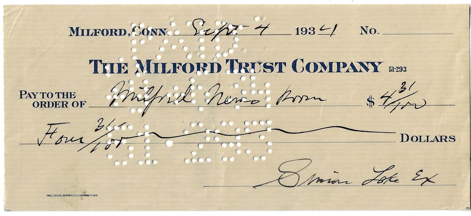 A $34.20 check signed by the inventor and engineer framed with a black and white photograph of him and his creation.
