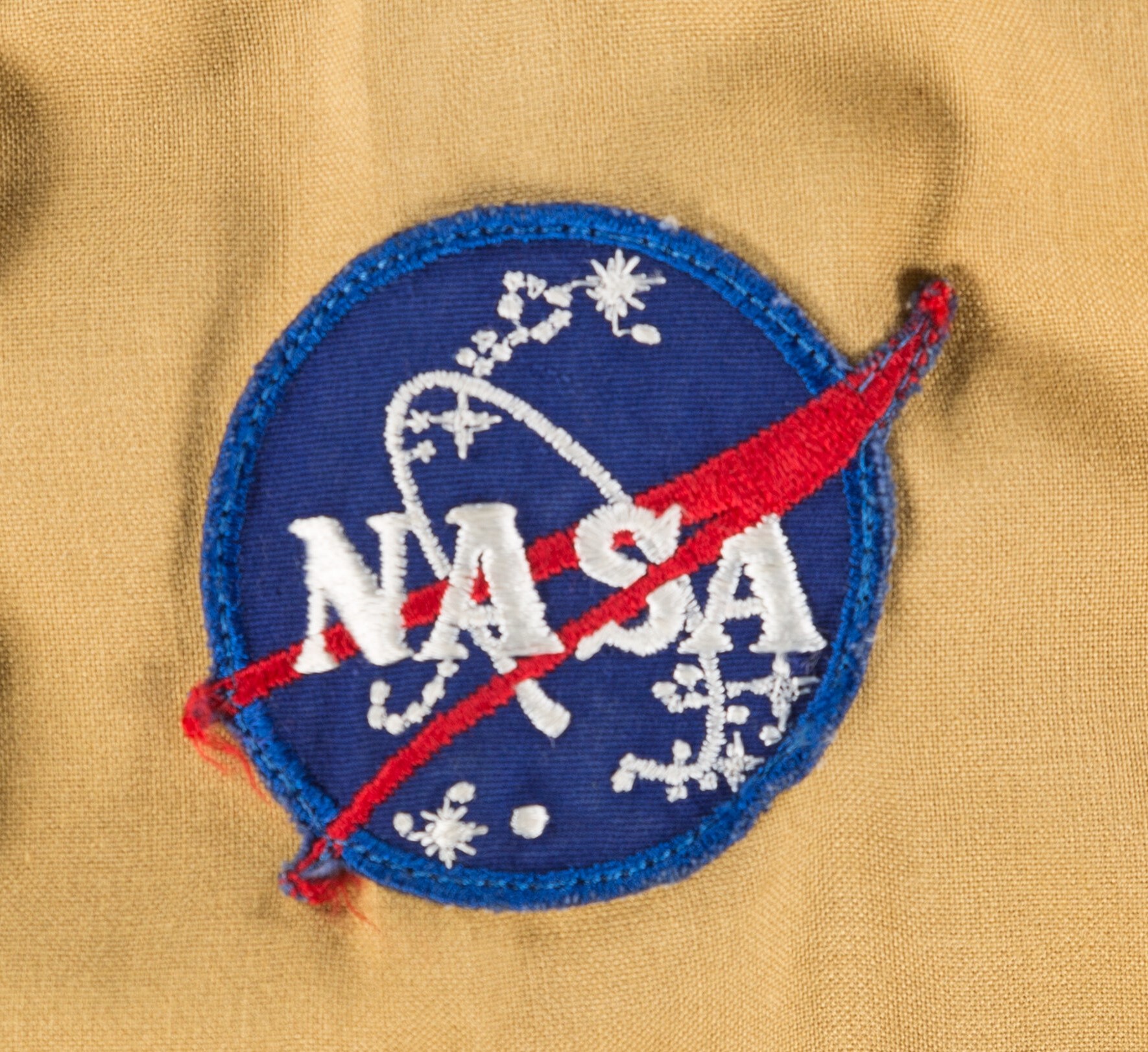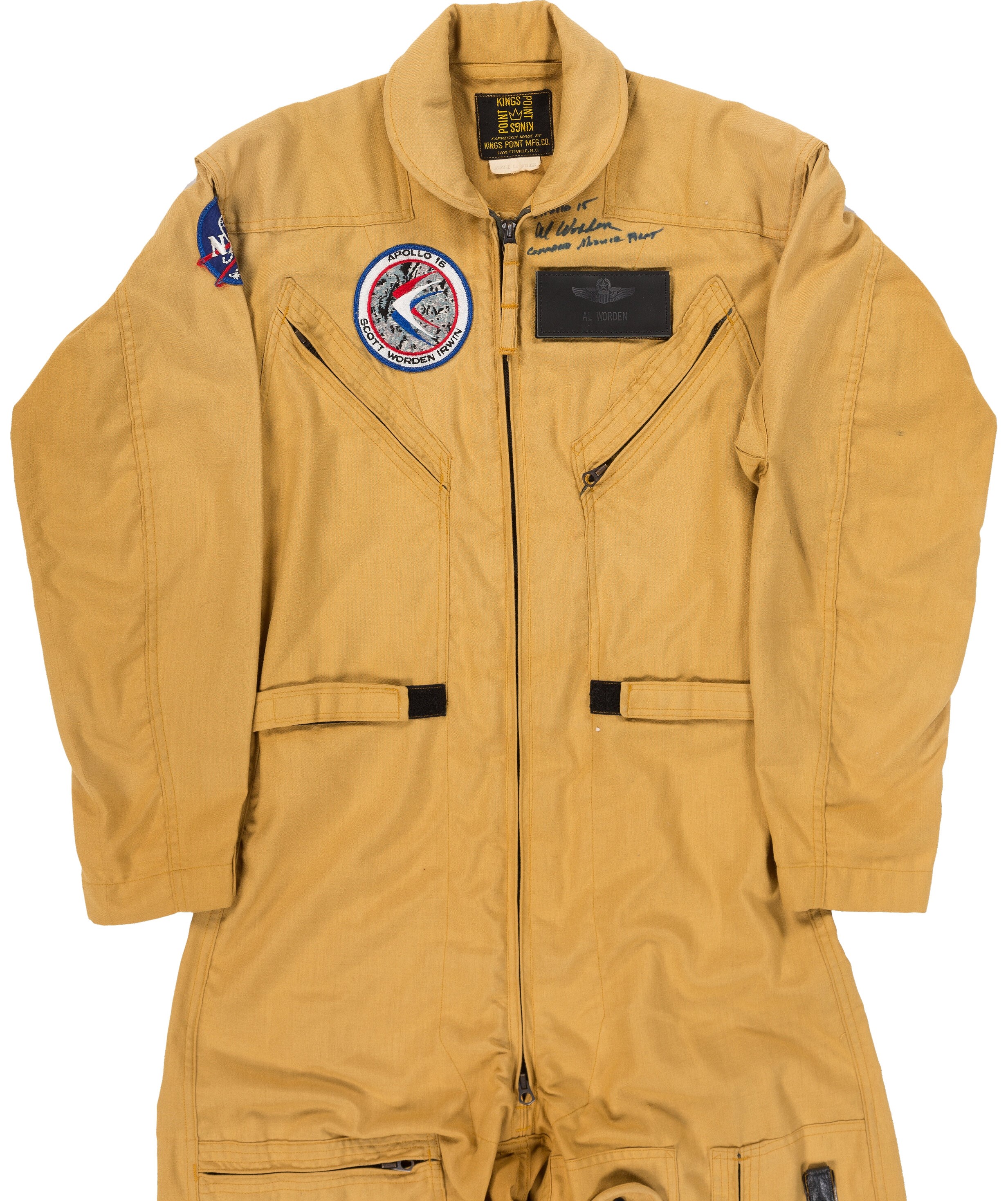 "This mustard-colored flight jumpsuit, made by Kings Point Mfg. Co. and worn by command module pilot Al Worden while preparing for his Apollo 15 mission, has NASA "meatball" patch on right shoulder, Apollo 15 mission patch on right chest, Velcro pilot's wings on left chest, and "Alfred M. Worden" cloth name tag sewn below manufacturer's label. From Al Worden's personal collection.