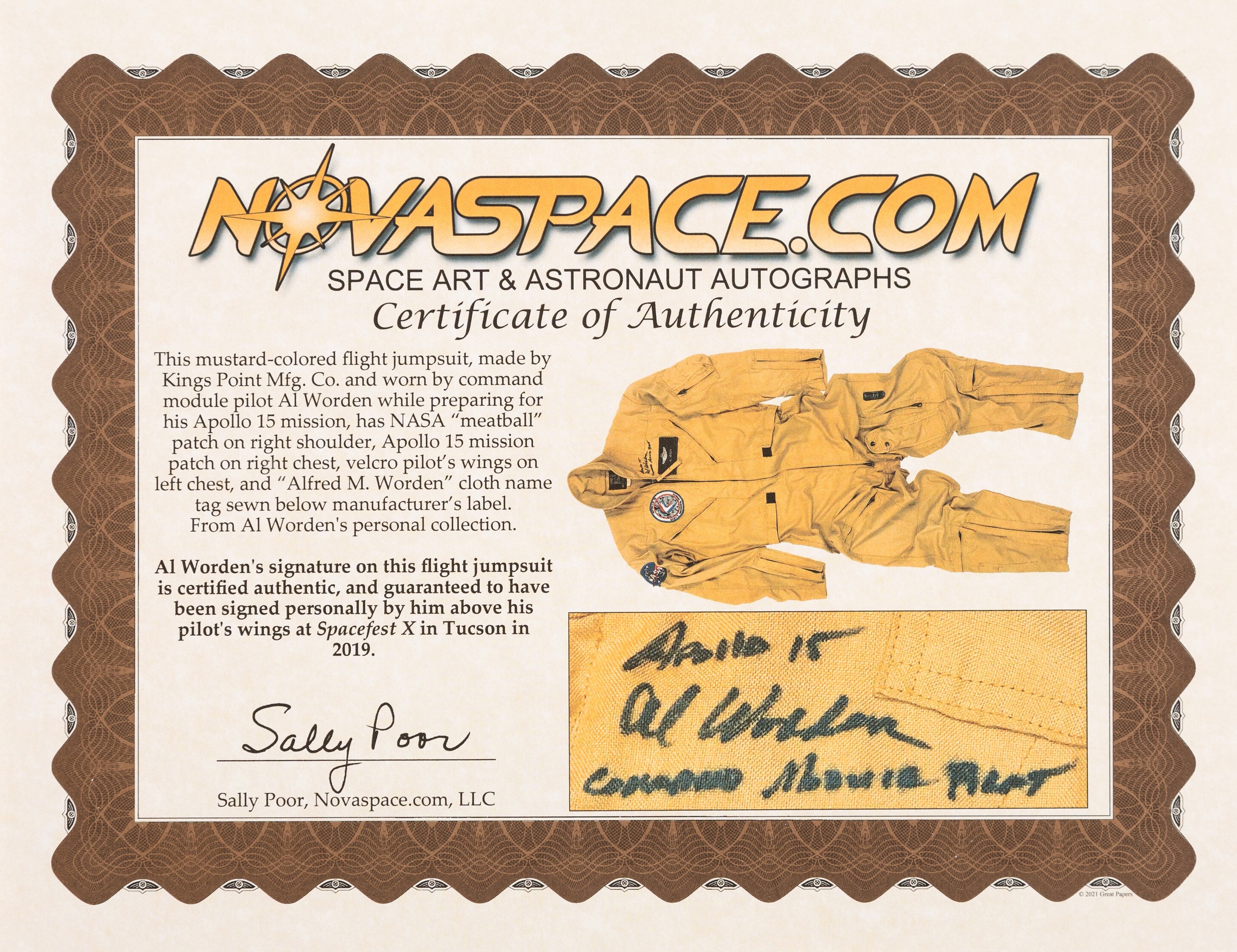 "Al Worden's signature on this flight jumpsuit is certified authentic, and guaranteed to have been signed personally by him above in Tucson in 2019."