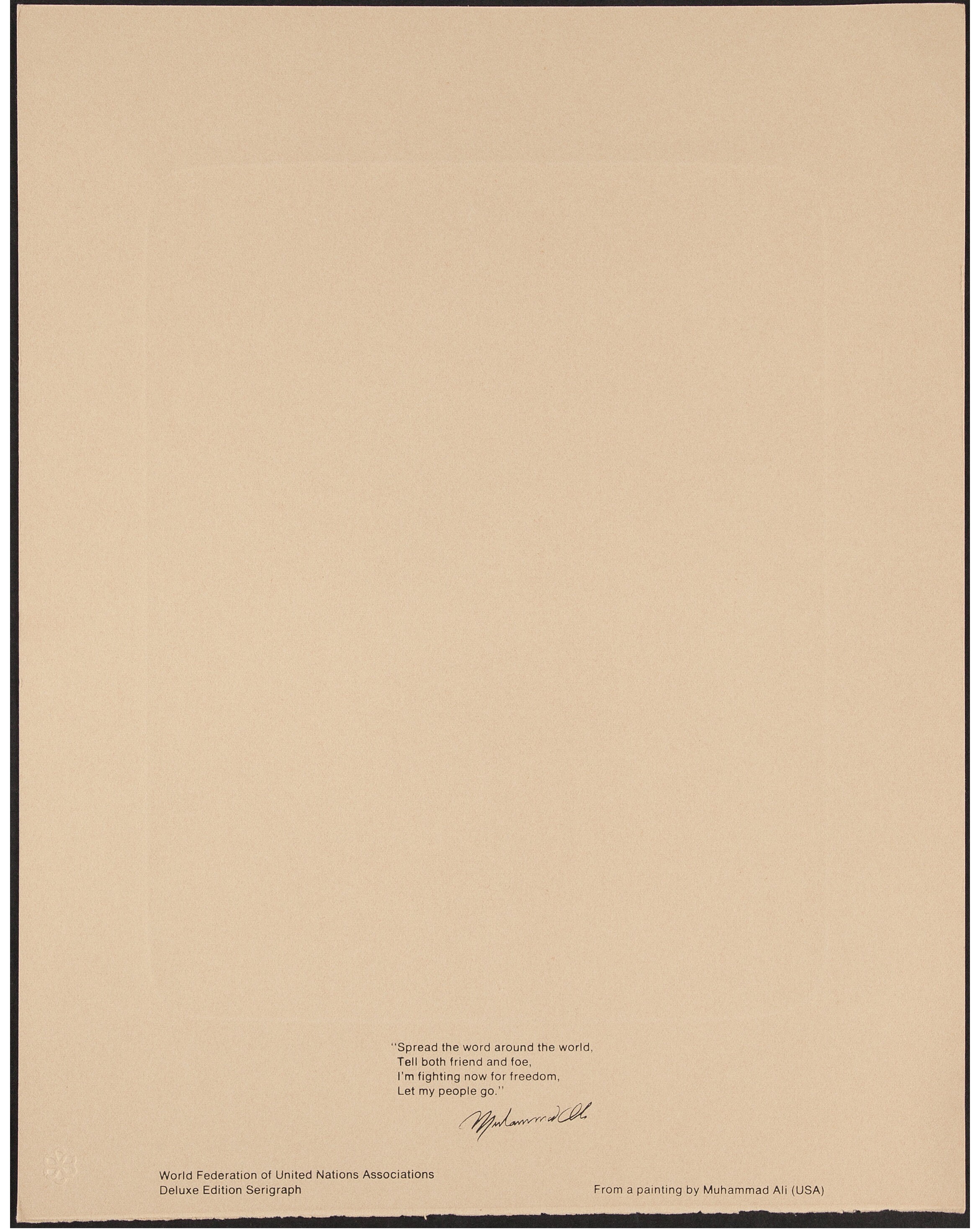 1979 Muhammad Ali Signed "Let My People Go" Limited Edition (98/250) Silkscreen Print on Paper. "Spread the word around the world, Tell both friend and foe, I'm fighting for freedom for South Africa, So, Let my people go." -- Muhammad Ali, United Nations, April 13, 1979.