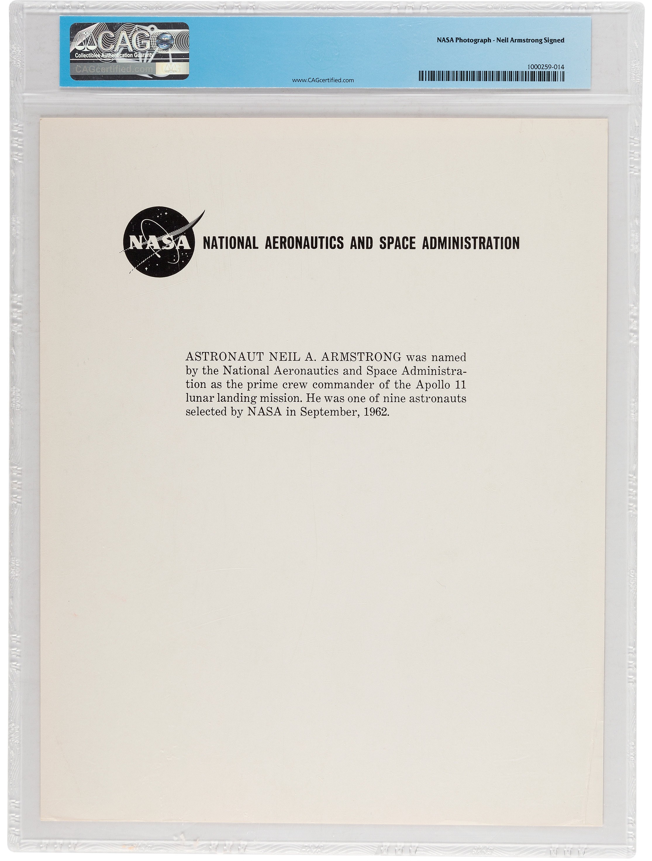 An 8" x 10" NASA lithographed print with printed information on the verso. It is neatly signed in black felt tip with excellent contrast: "Neil Armstrong/ Apollo 11". This is the ultimate item for Space autograph collectors made even more desirable by his addition of the mission number. Sealed in a numbered archival holder, CAG 1000259-014. This lot will include a Statement of Provenance signed by Neil Armstrong's sons, Rick and Mark.
