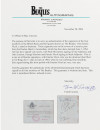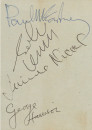 The Beatles Autograph Set With Jimmie Nicol Plus Black & White Picture in Mat (1964). We are very excited to be able to offer this rare hand-signed set with stand in drummer Jimmie Nicol. Jimmie took over for Ringo Starr for 11 days in June of 1964, when he was suffering from tonsillitis. The autograph page measures approx: 3 3/4" by 5 1/4" in mat. It is hand signed by: Paul McCartney, John Lennon, Jimmie Nicol, and George Harrison. The signatures are on the reverse of a security pass from the Doelen Hotel in Amsterdam, which has been date stamped June 5th, 1964. Also included is a nice black and white image of the boys.