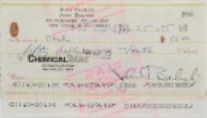 A vintage original 6" x 2.75" crème paper joint account (with wife Judith) check from Chemical Bank with clean edges and additional duplicate paper routing numbers strip tipped to bottom, handwritten to the order of "Cash" for "$50," dated "Feb 25 1975," signed "John A. Belushi." Exhibiting bank ink stamps and markings.