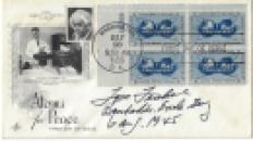 First day cover signed and inscribed by Thomas Ferebee, "Tom Ferebee, bombardier Enola Gay, 6 Aug. 1945", honouring "Atoms of Peace/Albert Einstein" . Postmarked Washington, on July 28, 1955, with four 3-cent Atoms for Peace stamps.