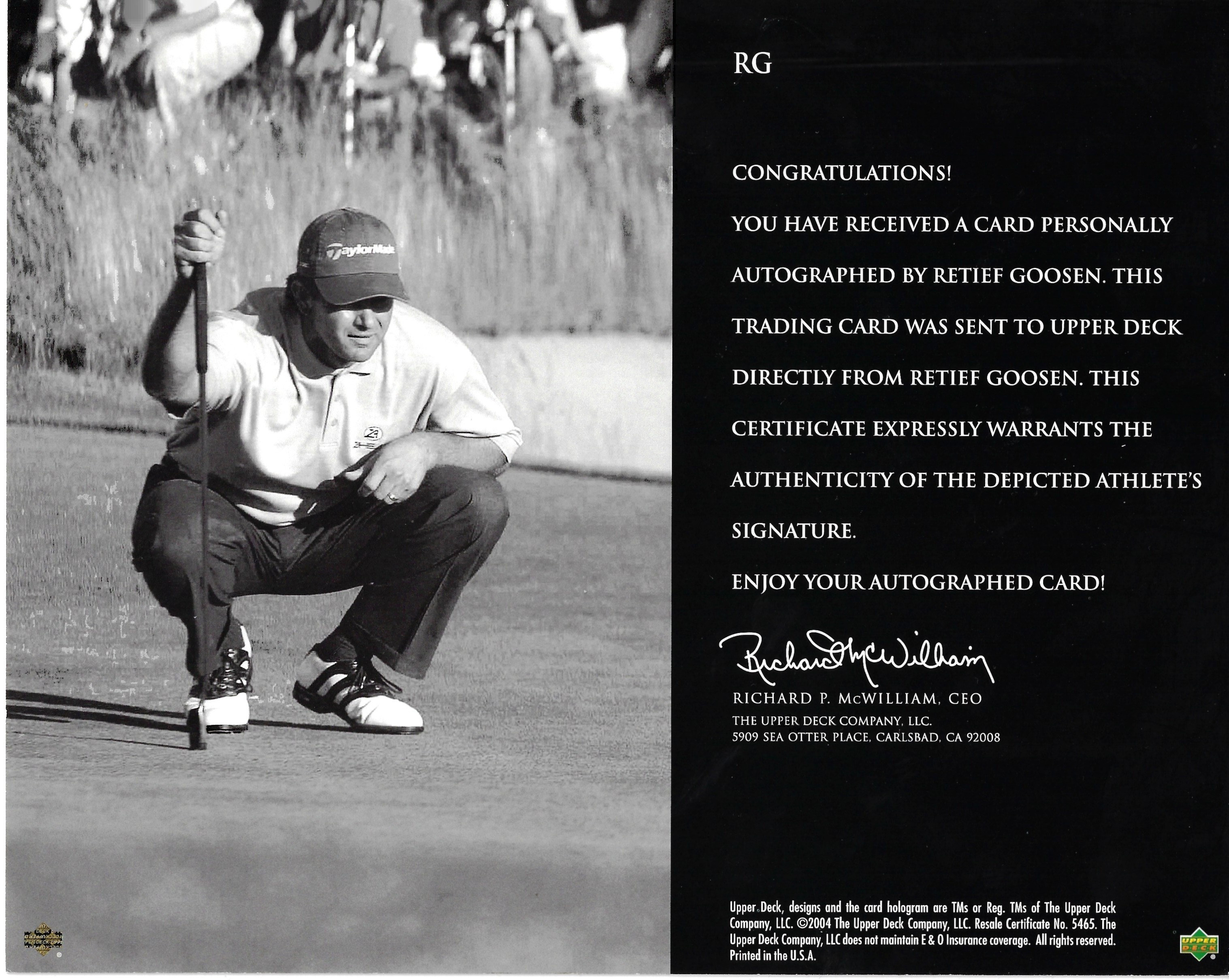 Retief Goosen, signed 8 x 10 photo. "2004 Upper Deck SP Authentic Signature", US Open.