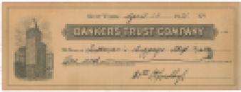 Rare Bankers Trust Company uncancelled check, 7.25 x 2.75, filled out in another hand and signed by Lindbergh, “$1.50 C. A. Lindbergh,” payable to Luttman’s Luggage Shop for $1.50, April 14, 1931. Several unobtrusive flattened vertical folds, a few creases, and overall toning, otherwise fine condition.