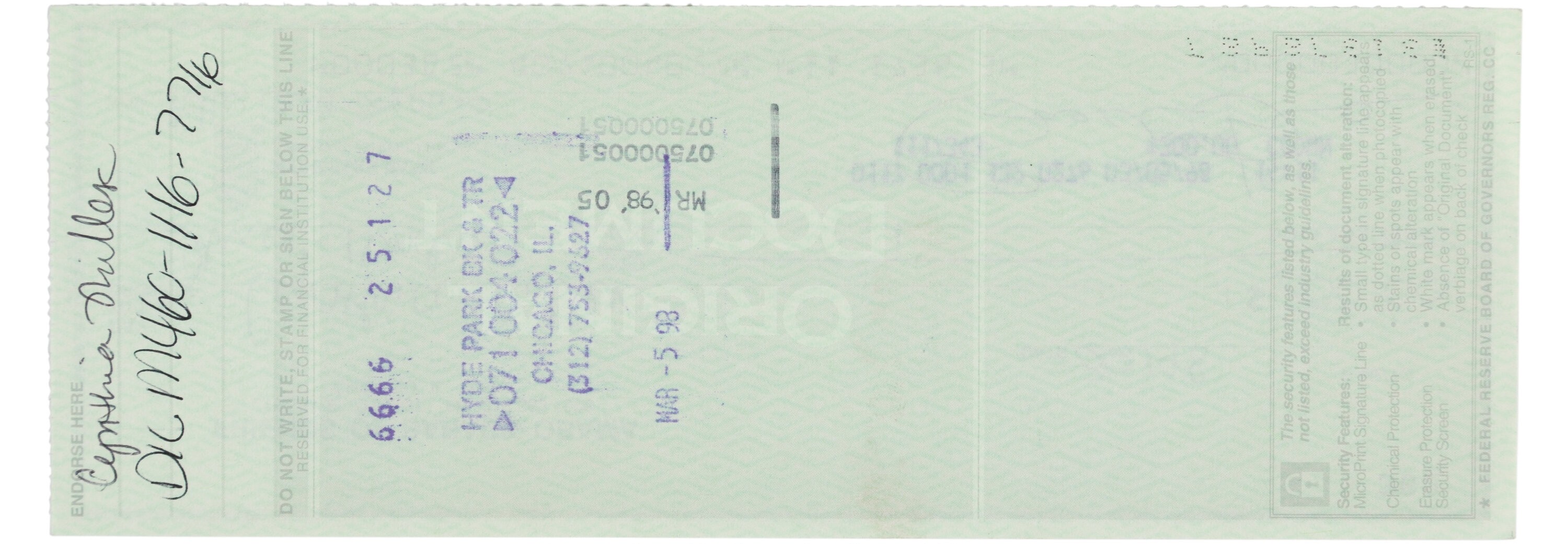 8.25" x 3", Chicago, Illinois; March 2, 1998. 8 1/4" x 3" on "Friends of Barack Obama" account. Made out to Cynthia Miller for supplies. Boldly signed by Obama.